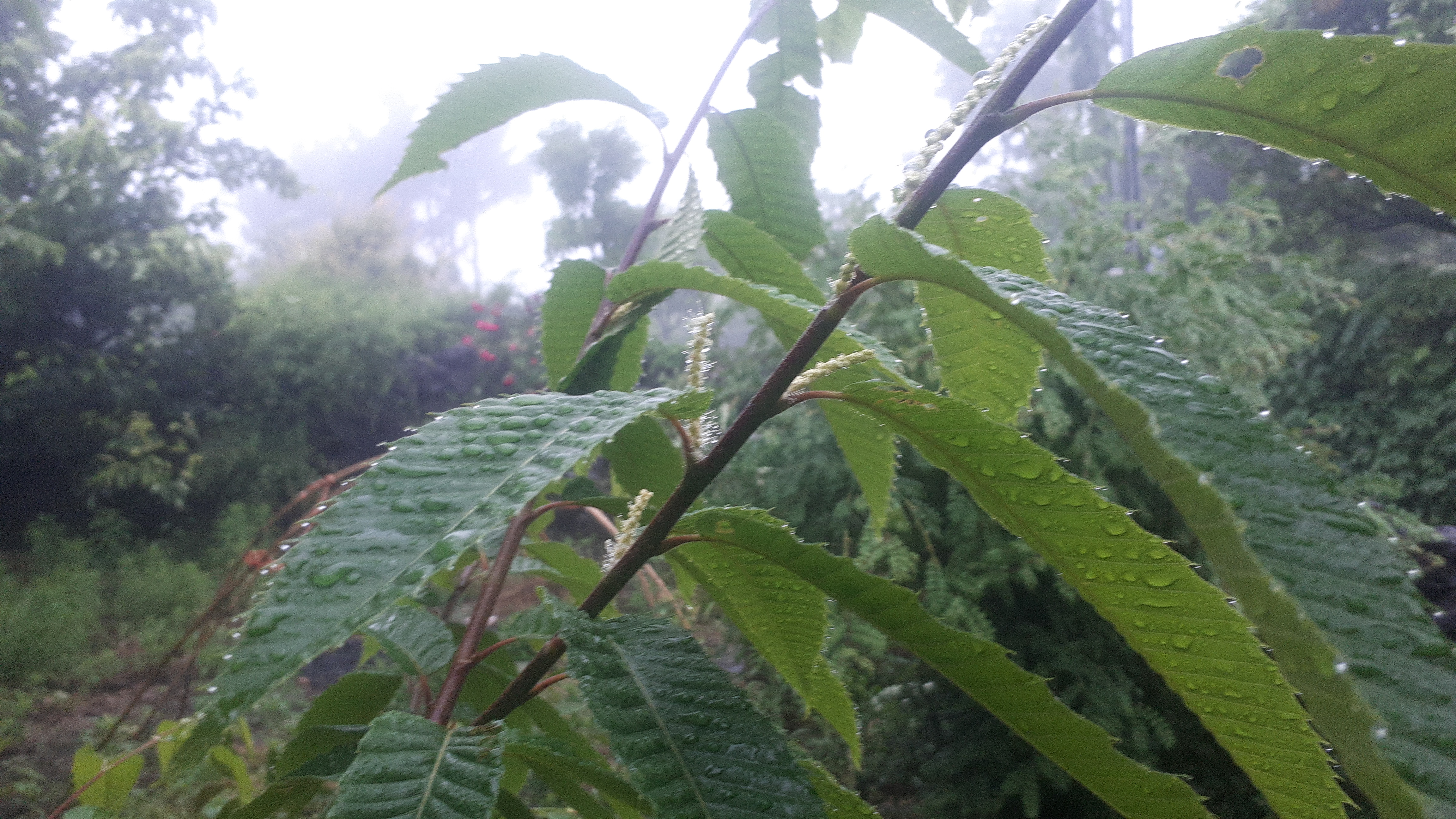 잎과 밤꽃이 비에 많이 젖어있는 상태입니다