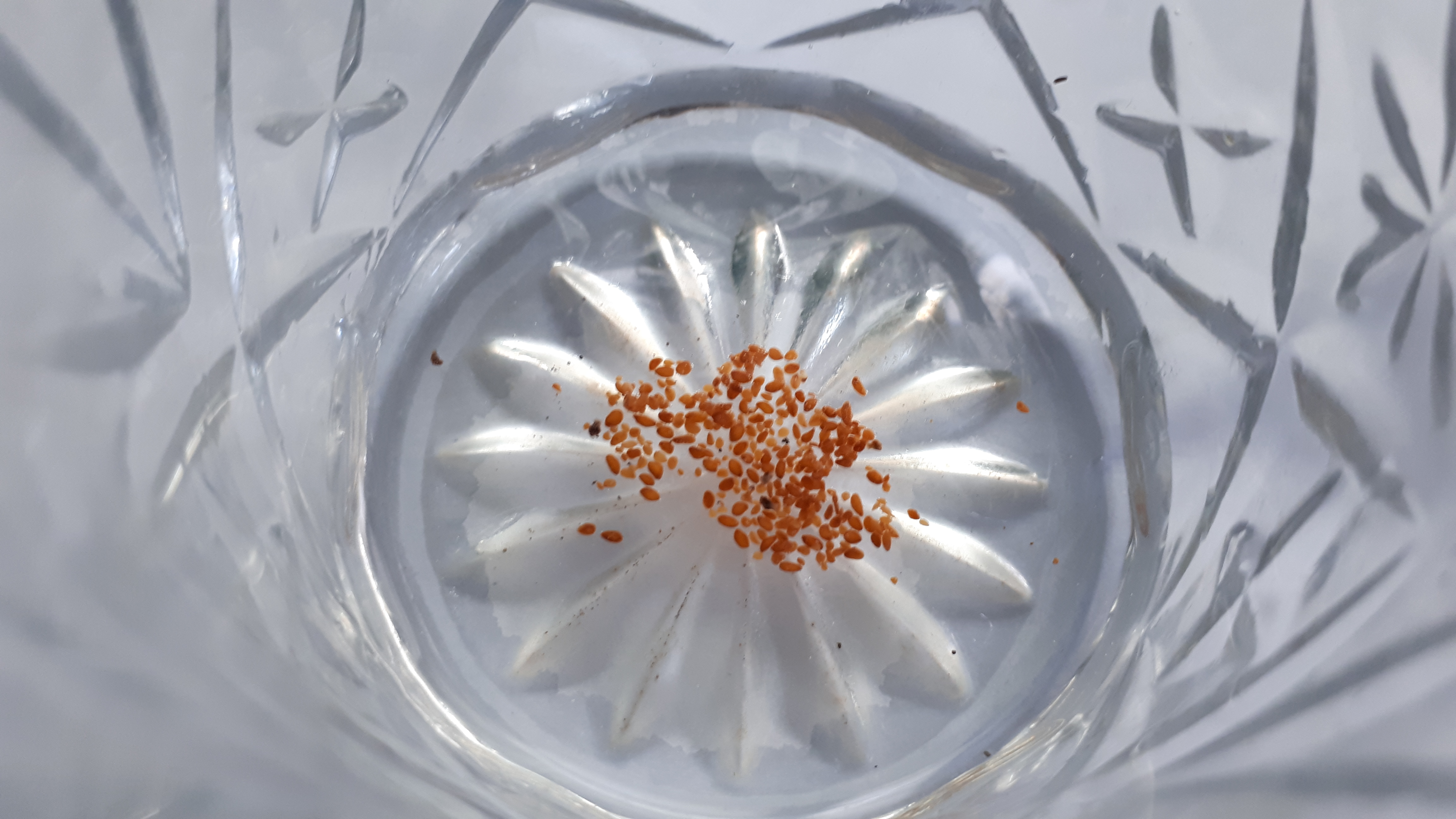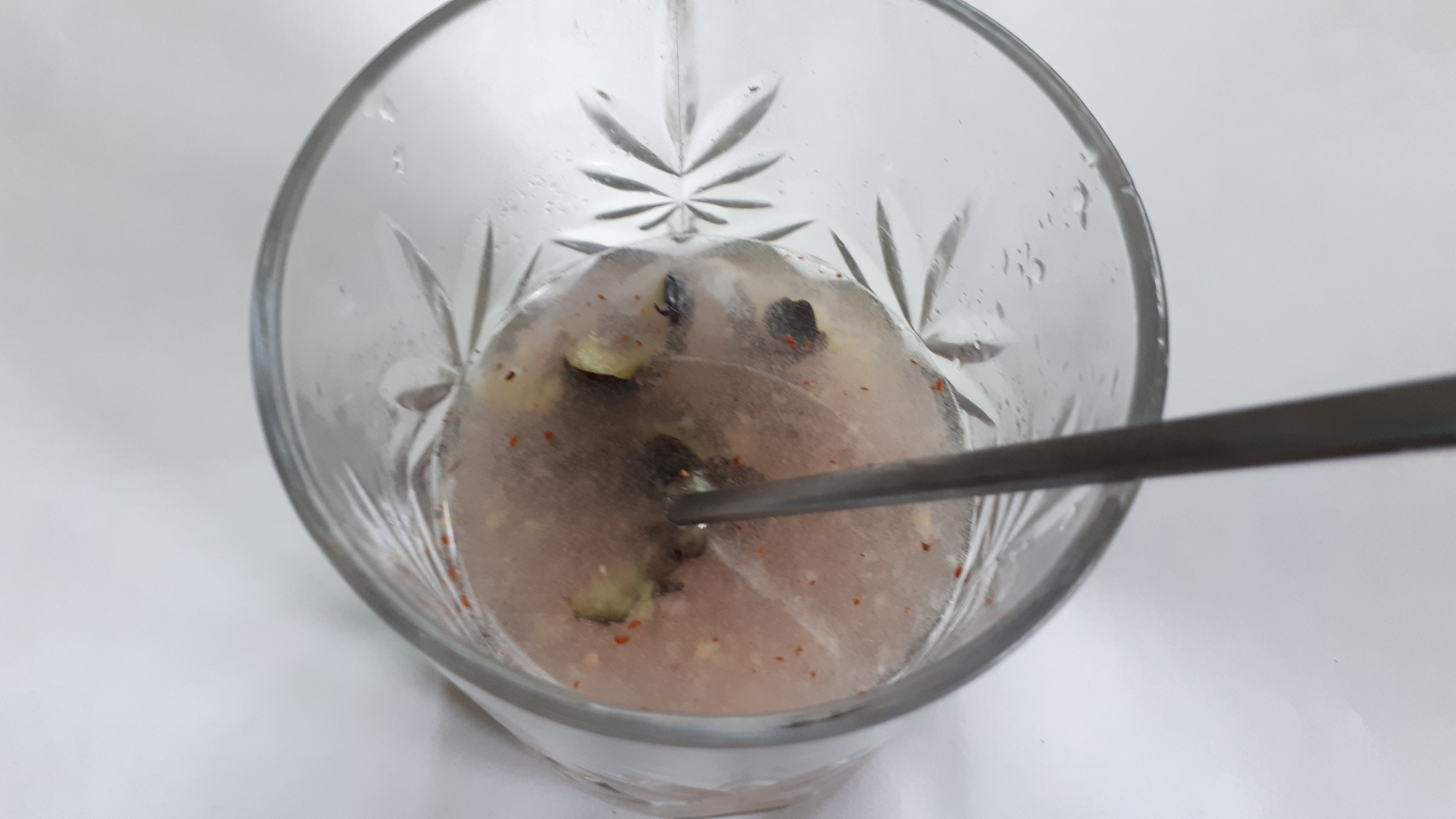 젓가락으로 물을 저어주면 씨앗은 바닥 한 곳에 모입니다