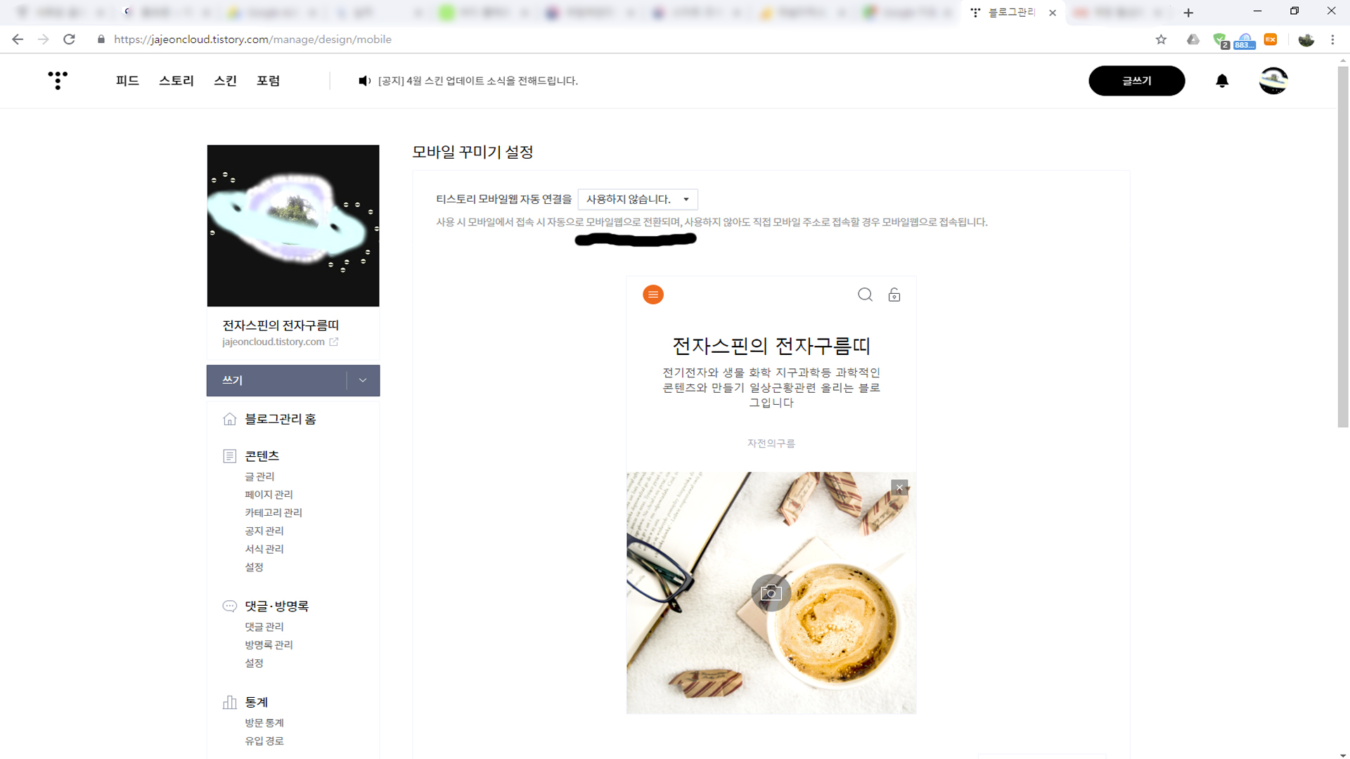 거의 대부분은 "티스토리 모바일 웹 자동연결을 '사용합니다' " 이렇게 되어있습니다