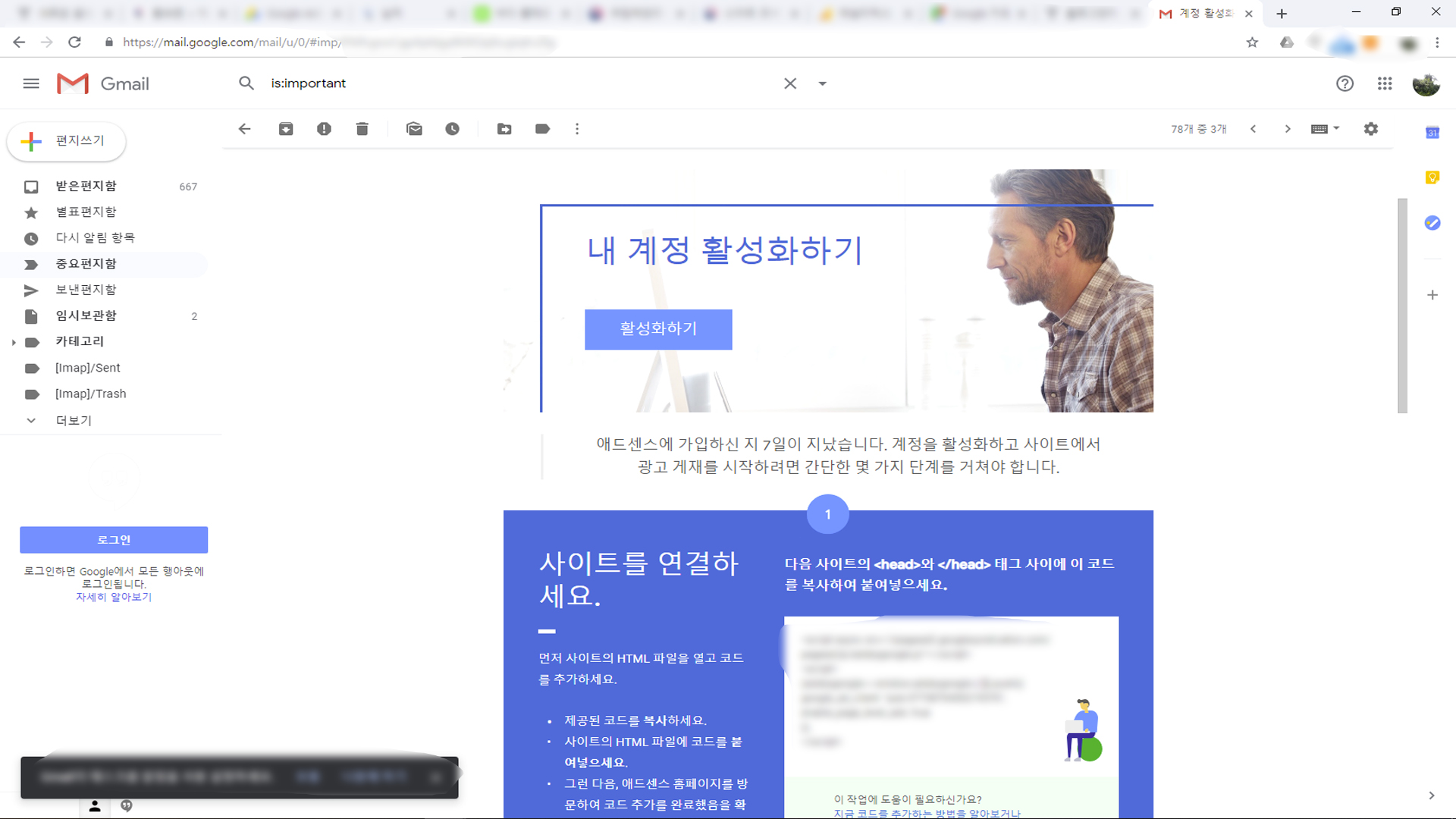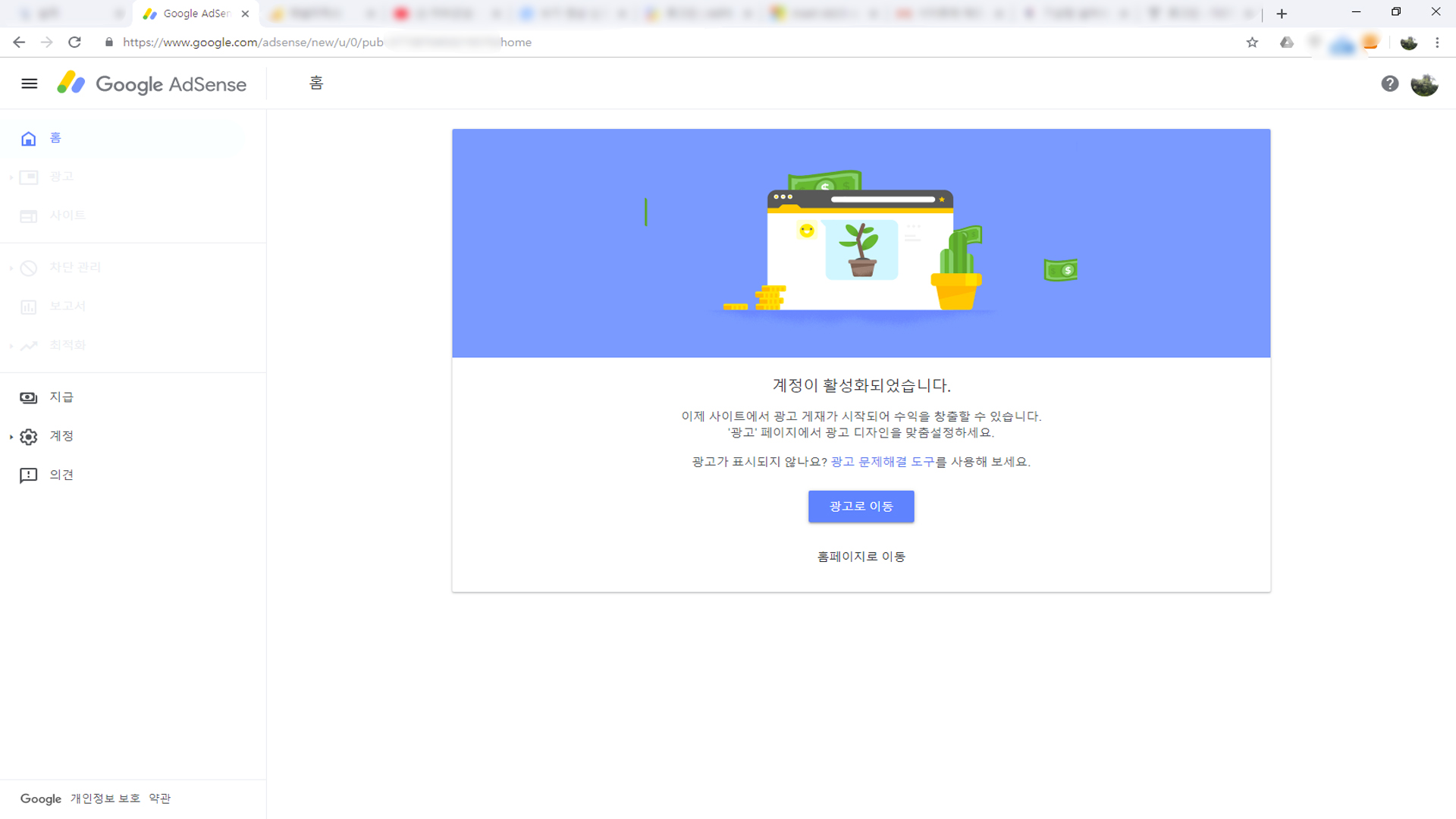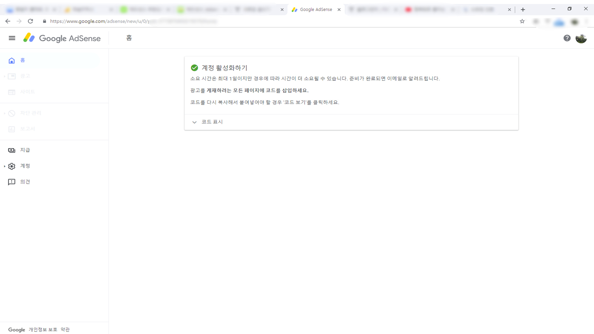 애드센스 사이트에서 아직도 계정 활성화하기 단계인가 싶어 습관적으로 누르다가