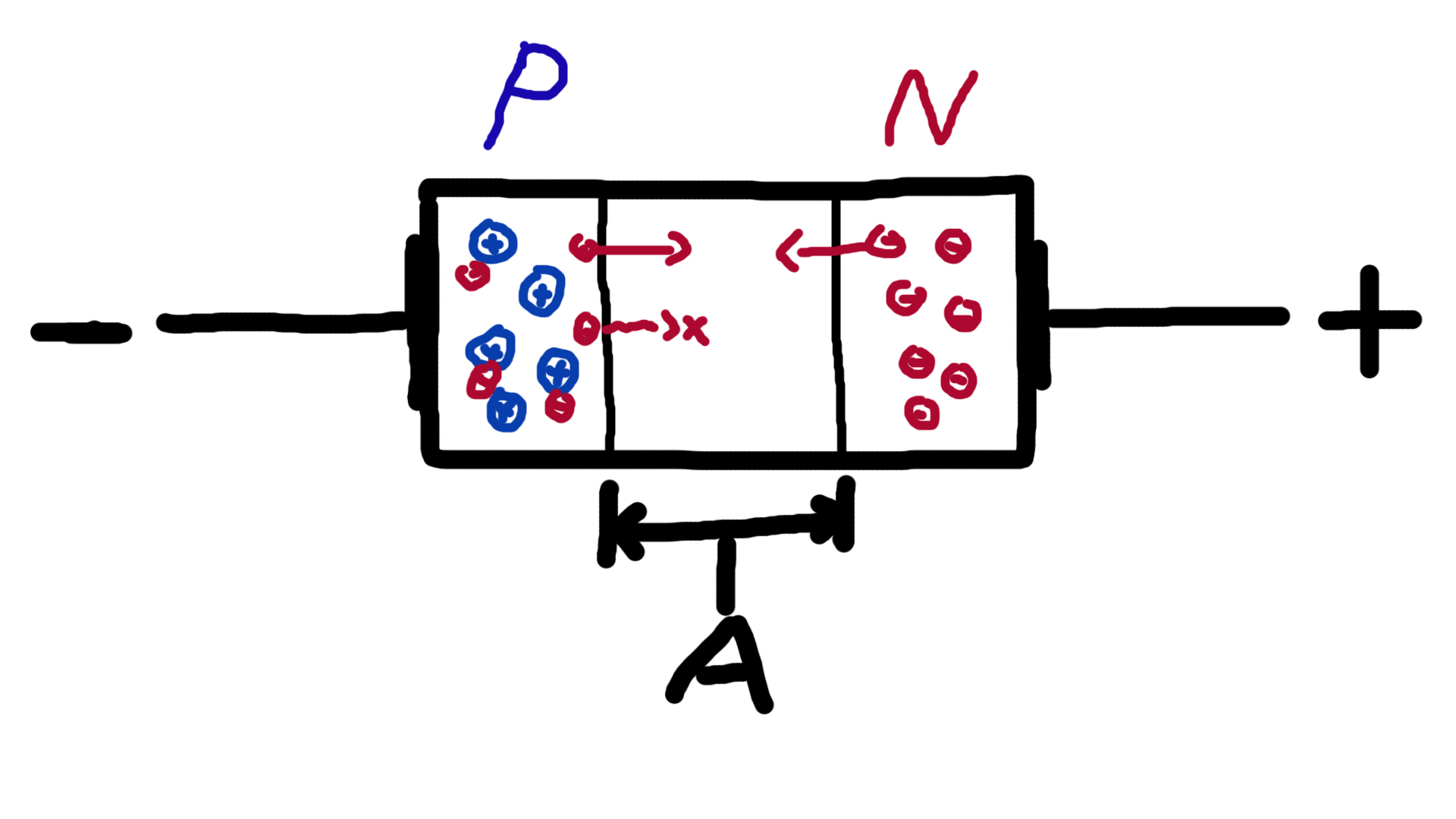 P에서 탈출한 전자가 많아지게 되고 N 반도체의 - 전자들도 버티지 못한 상태가 됩니다