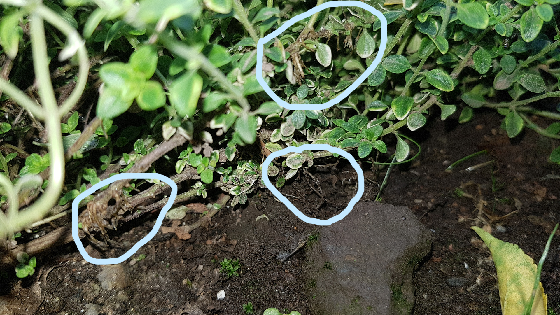 레몬 타임 줄기가 땅에 누워서 자라다가 이렇게 뿌리를 냈습니다