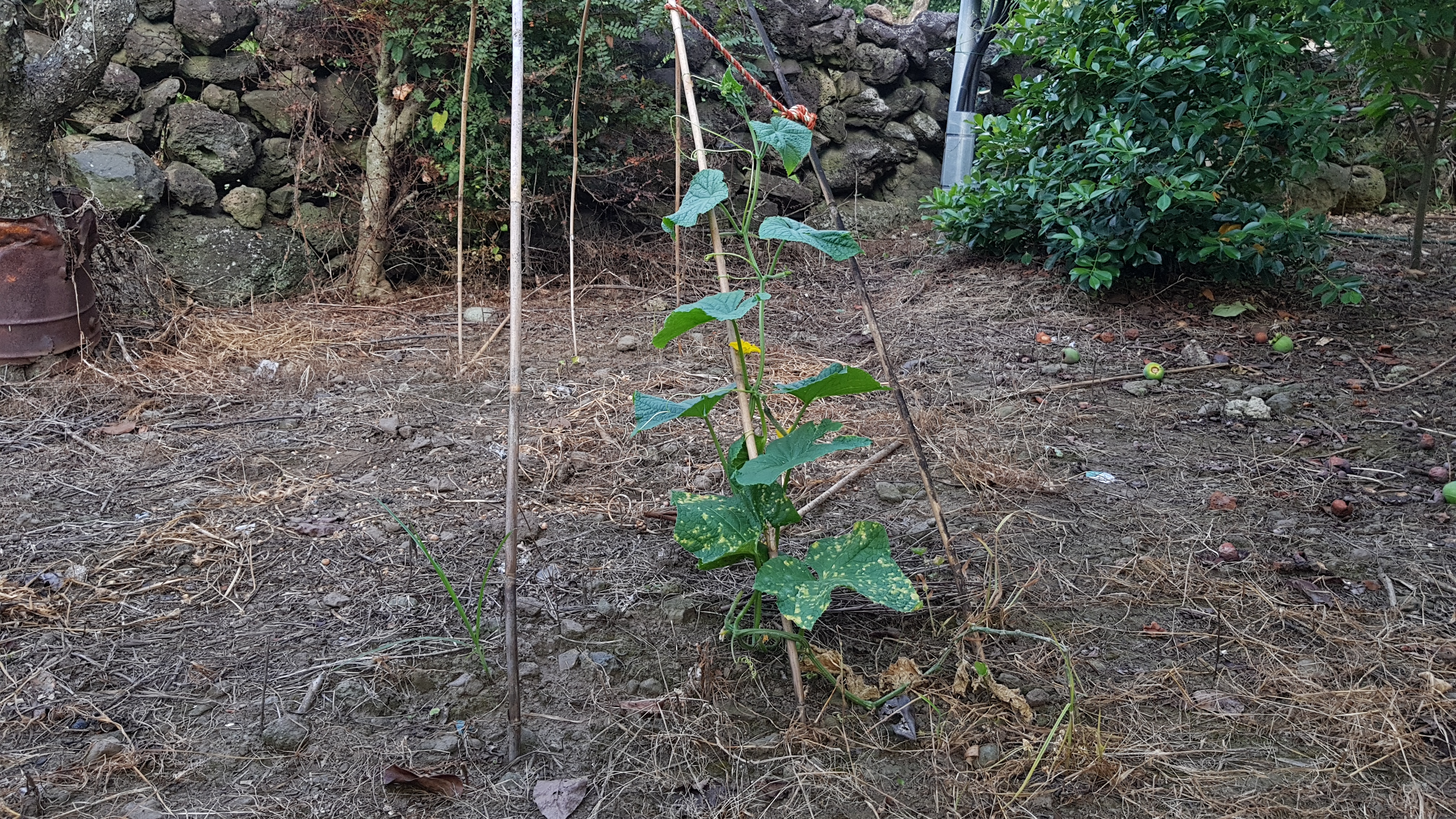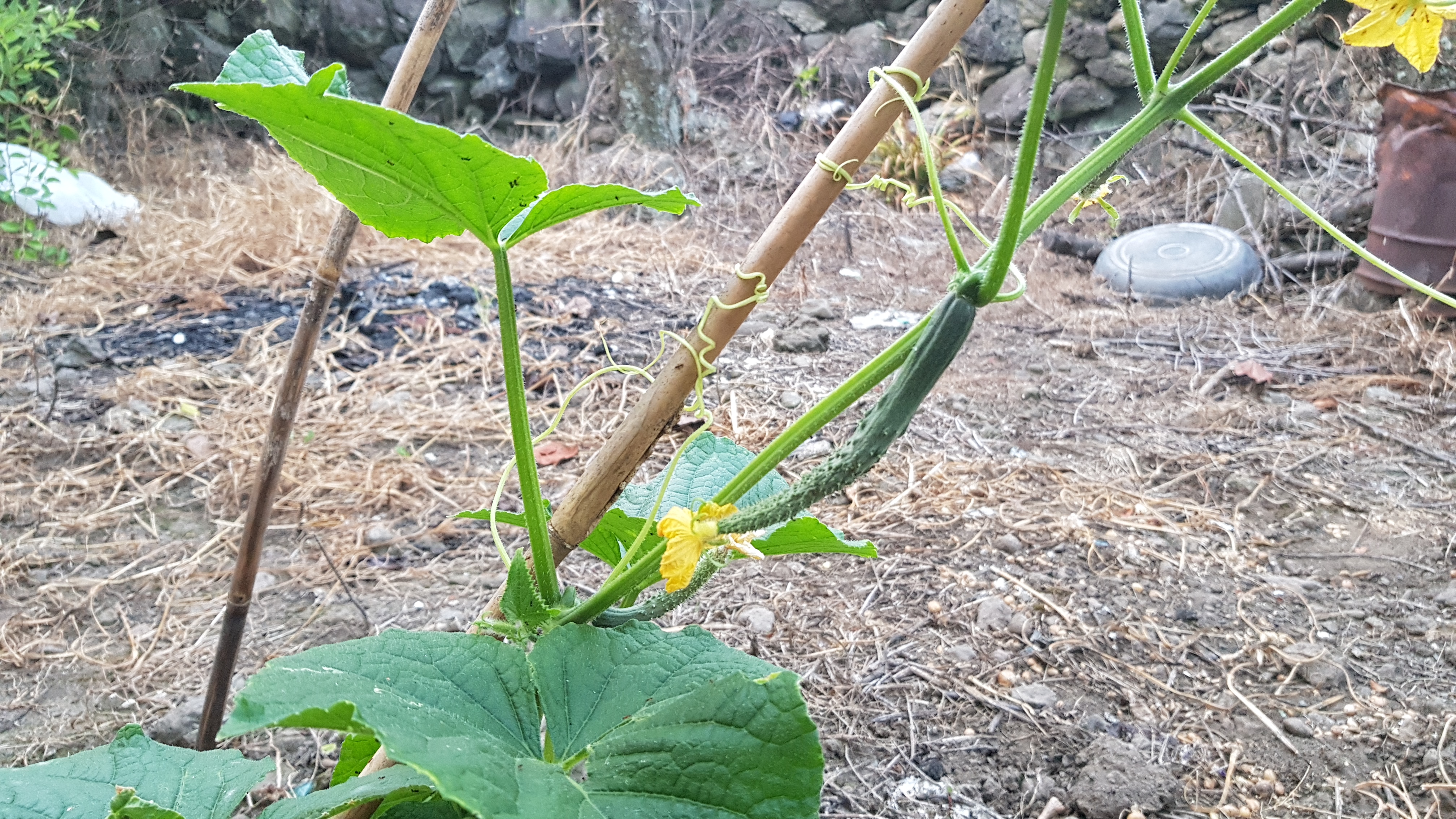 이 주변에 원래는 6그루 정도 오이를 심었었는데 집중호우 지난 다음 건조해질 때 전부 말라버려서 사진에서 보이는 오이를 제외하고 지금 현재 없는 상태입니다 그래도 하나라도 살아남아줘서 다행입니다