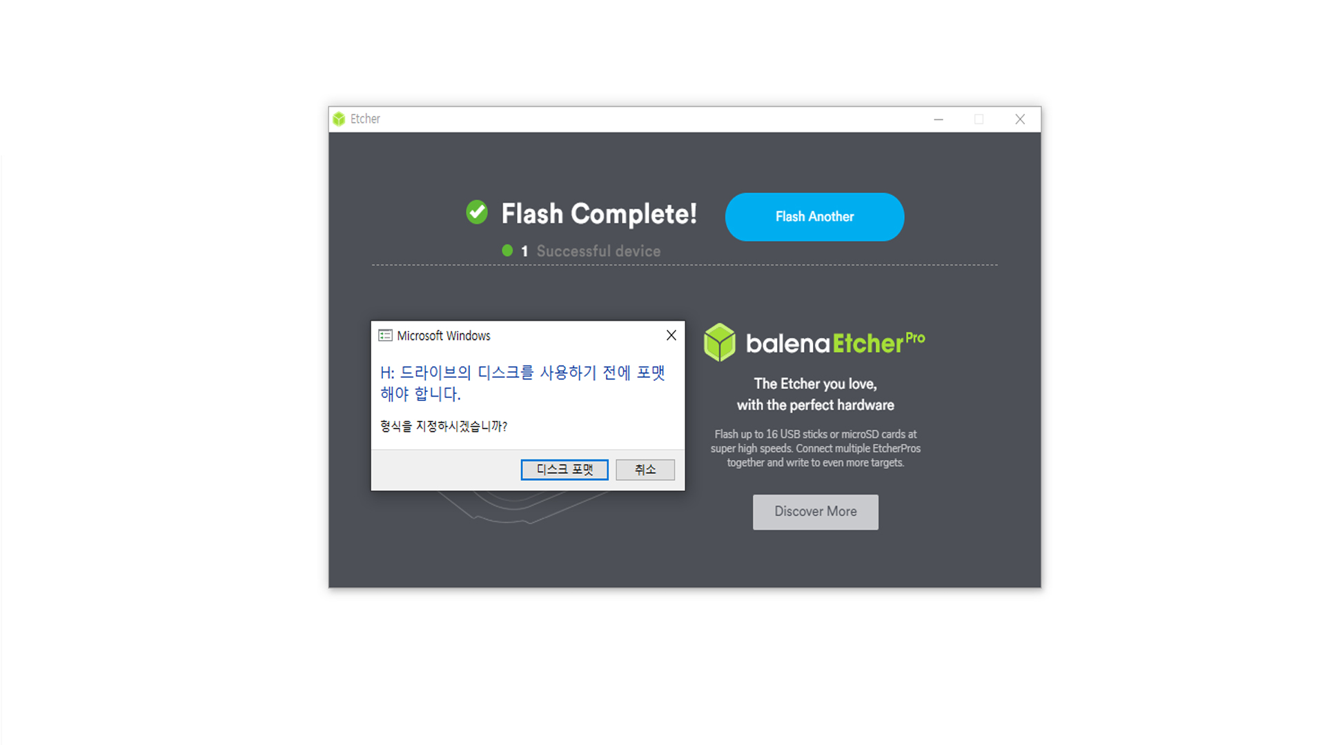 이런 메시지가 뜨는 이유는 USB를 Windows에서 저장장치로 인식하지 못해서 생기는 문제인데 이미 OS가 잘 설치가 되어서 USB 드라이버로써 역할을 안 하는 것이므로 무시해도 됩니다 만약 사용하려는 SBC 개발 보드나 컴퓨터에서 인식이 되지 않았다면 이미지 파일에서 문제가 될 가능성이 높기 때문에 이미지 파일을 다시 한번 확인하고 다시 같은 방법으로 구워주면 됩니다