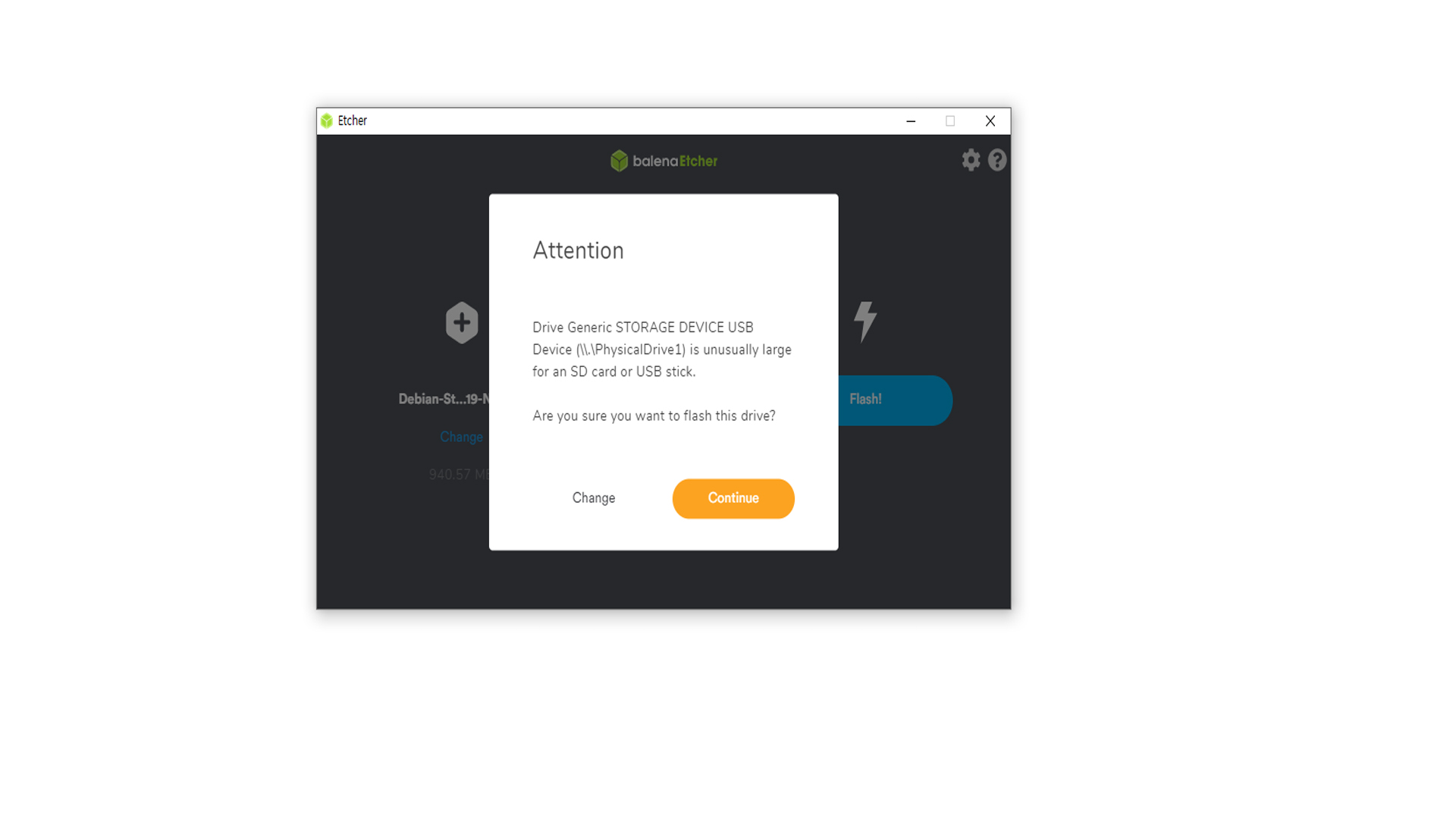 사진처럼 Flash! 버튼을 눌러주면 이런 창이 한 번 더 뜨게 됩니다 이 경고창은 USB 저장장치를 플래시 하게 되면 안에 있는 데이터를 전부 포맷한 후 OS를 굽기 때문에 뜨는 경고창입니다 특히 64GB 이상되는 저장장치는 고용량에 속하기 때문에 다시 확인하는 용도로 띄우는 경고창입니다