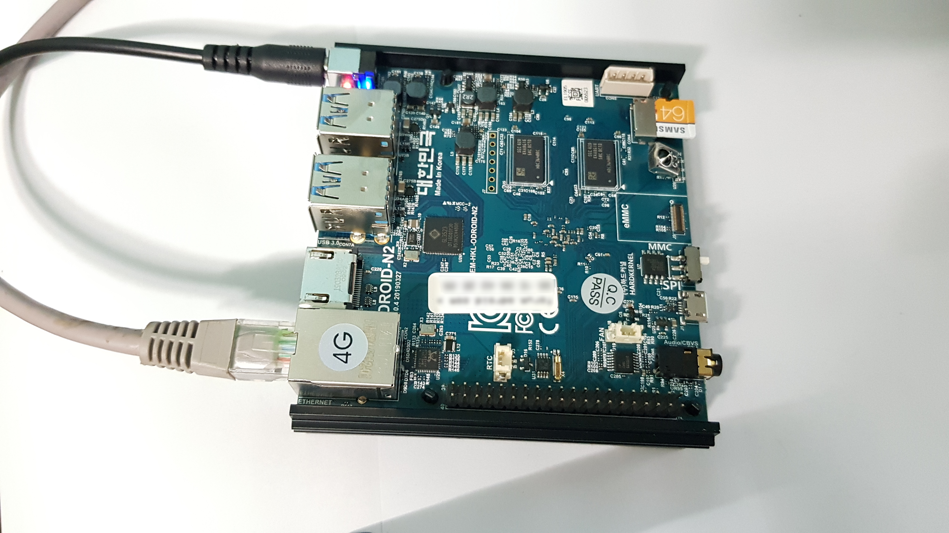 이 과정이 끝나면 2.1mm 전원선 쪽에 있는 파란색 LED가 일정 주기로 계속 깜빡이게 됩니다 그러면 부팅은 다 완료가 된 것이므로 사진처럼 랜케이블도 연결해서 SSH에 접속해보도록 할 것입니다