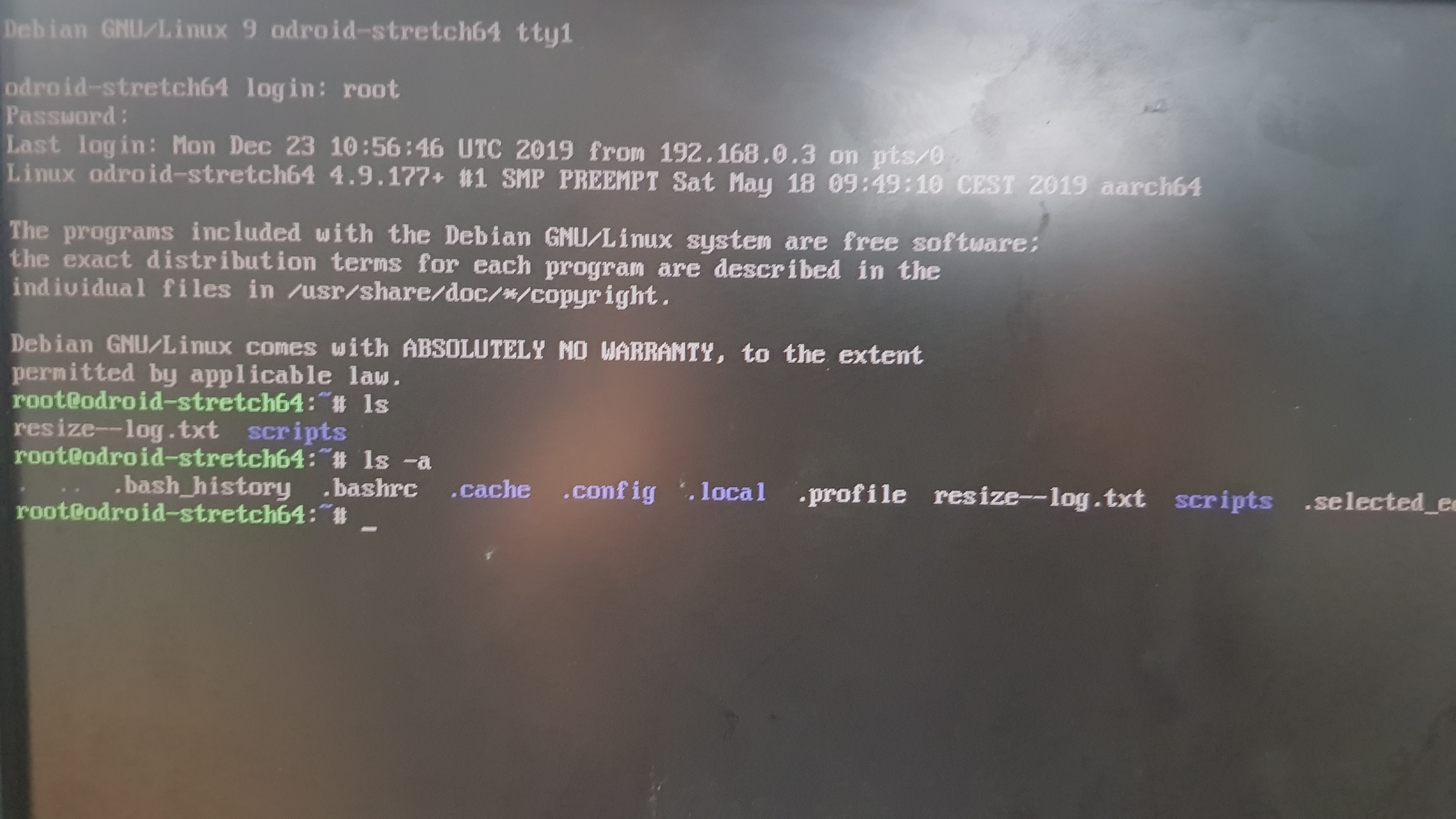 그리고 데비안 최소 설치 버전으로 이미지 파일이 제공되기 때문에 화면 연결해도 그대로 터미널에서 작업하는 것은 SSH와 같습니다