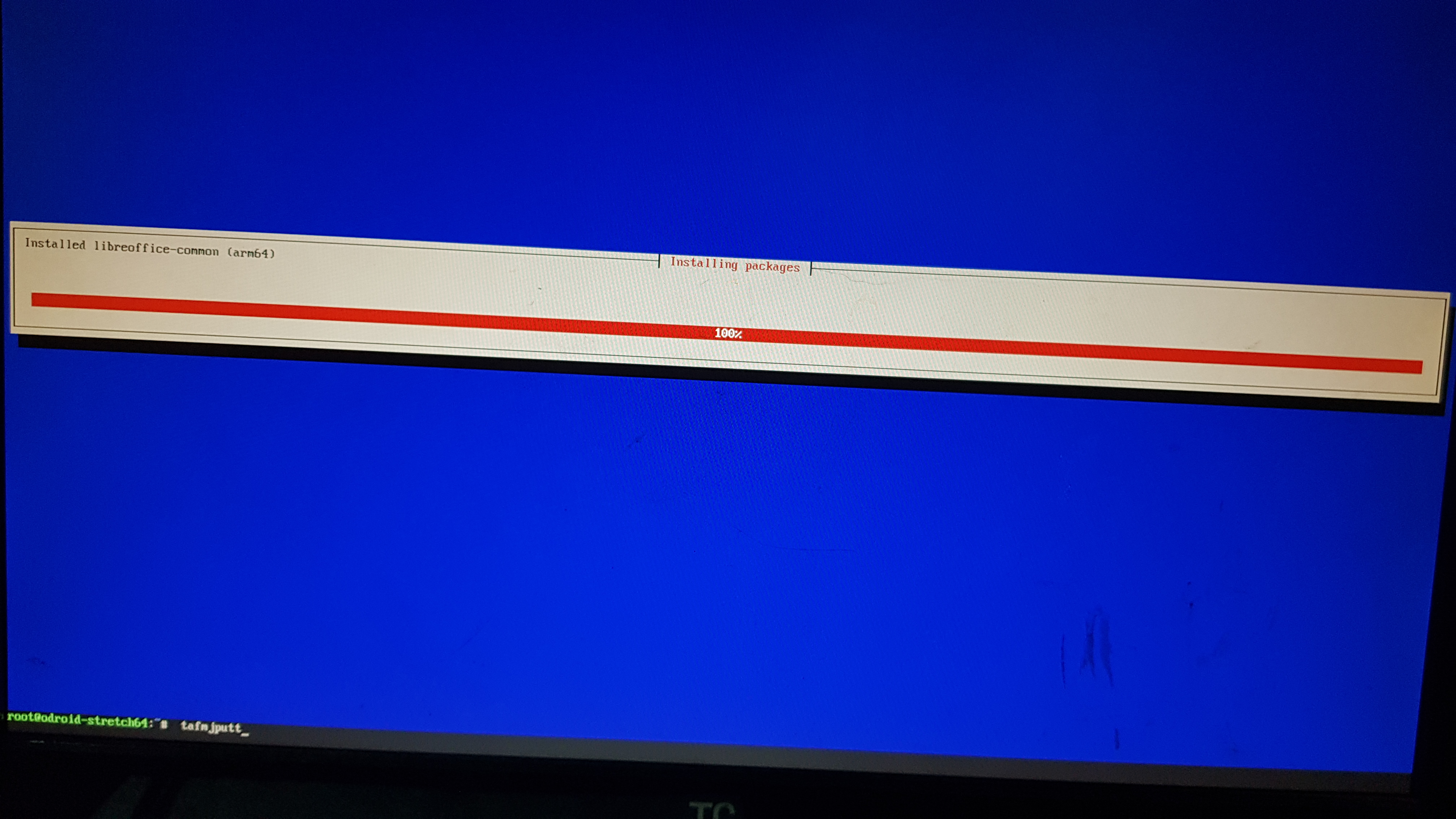 이렇게 100% 까지 퍼센트 바가 꽉 차 있으면 설치가 완료된 것입니다 자동 부팅은 되지 않고 아직까지는 CUI 환경을 유지하고 있는 모습입니다 이렇게 100% 까지 설치가 되면 밑에 명령어를 쓸 수 있도록 표시가 됩니다