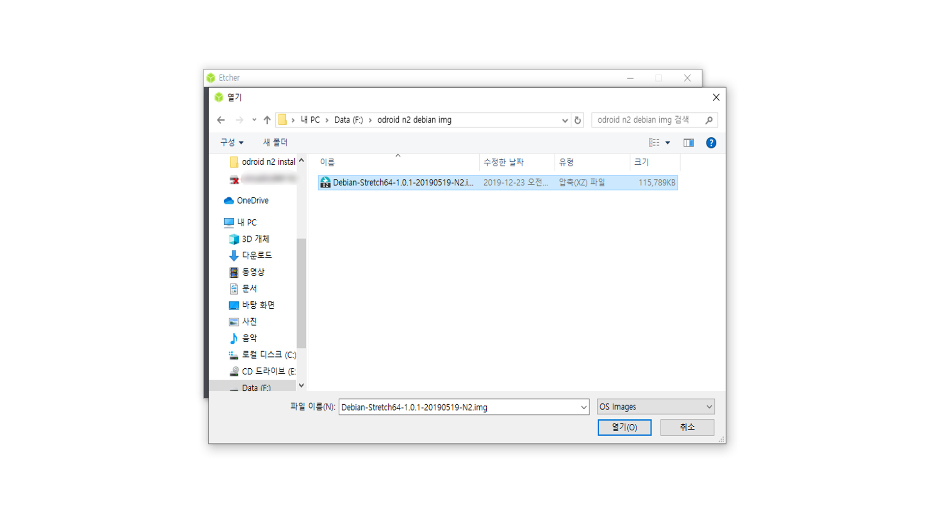 Select image를 선택하면 이렇게 파일 탐색기가 뜨게 됩니다 여기서 데비안 이미지를 선택해서 열기를 눌러주면 됩니다 데비안이 아니더라도 다른 이미지 파일도 USB나 SD카드에 구울 수 있습니다 다만 iso 파일 같은 경우에는 바로 실행할 수 있는 부트 파일이 없으면 에러 알림 창이 뜨게 됩니다 iso 파일을 이용해서 OS 설치 USB를 만들고 싶으면 rufus를 이용해서 구우면 됩니다