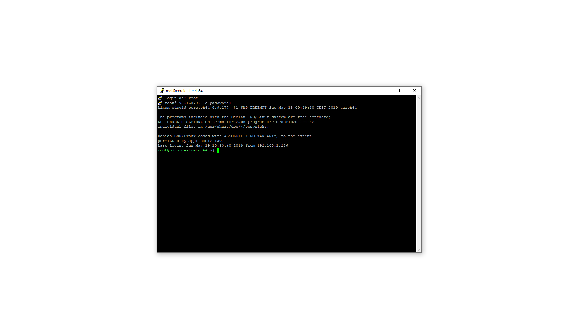 이렇게 검은 창이 뜨고 글씨가 보인다면 장치는 성공적으로 부팅이 되고 SSH접속도 잘 된 상태입니다