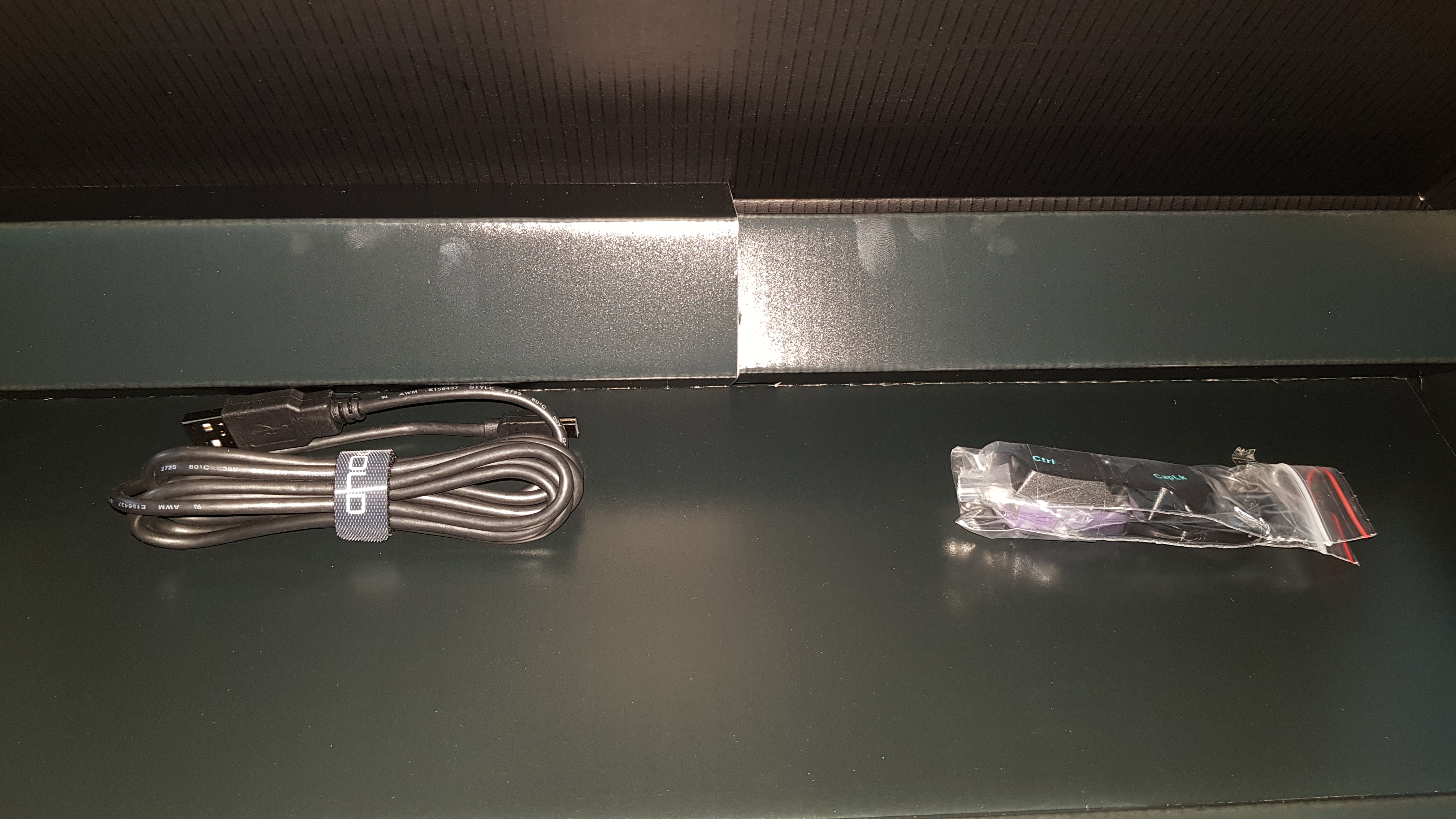 키보드 주변 부품입니다 키보드 상자에서 키보드를 꺼내보면 이렇게 사각형 모양의 공간이 보입니다 이 공간을 열어보면 키보드 케이블과 작은 지퍼백에 포장된 키캡과 ps2 usb 젠더 키캡 리무버가 있습니다