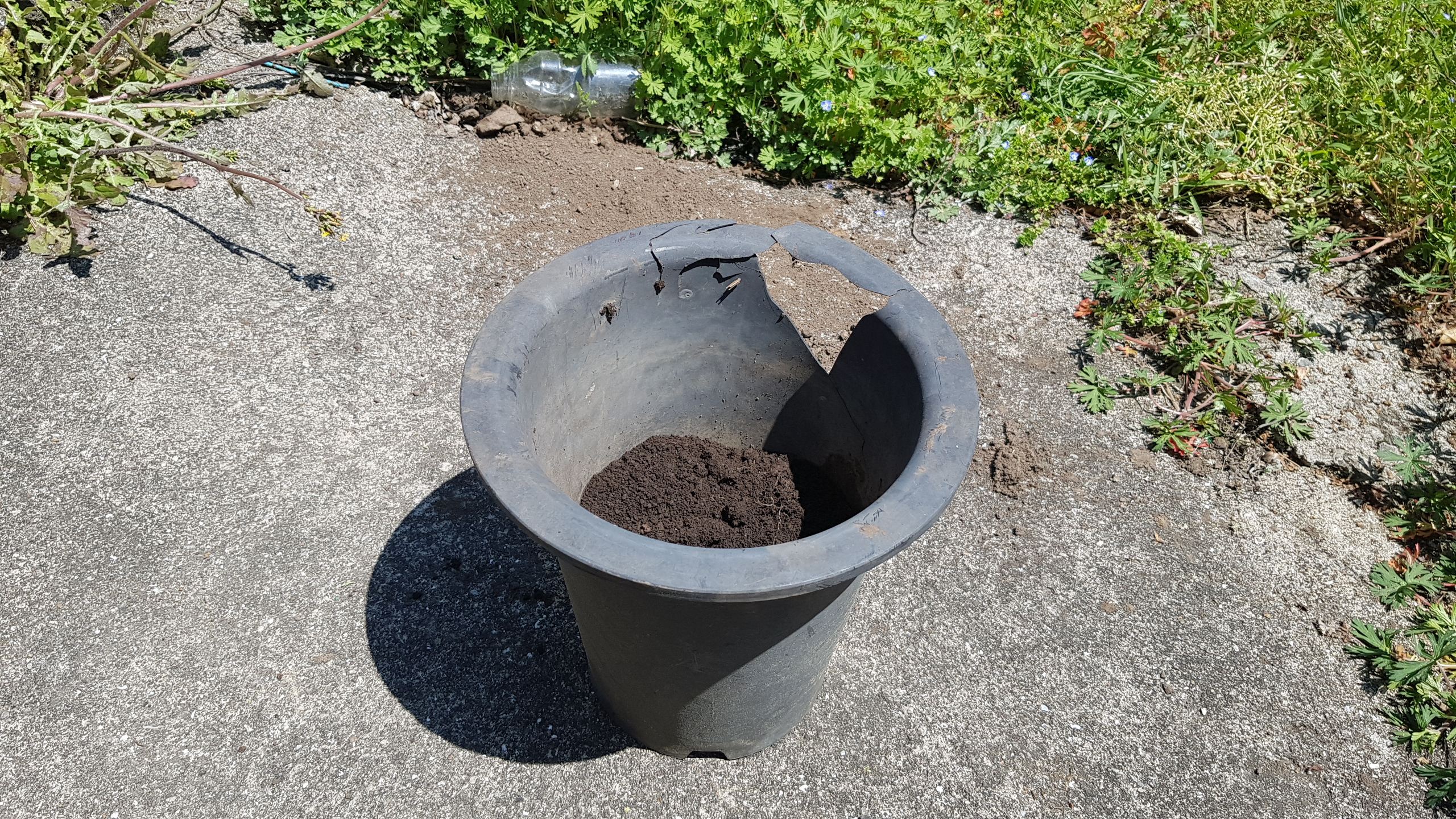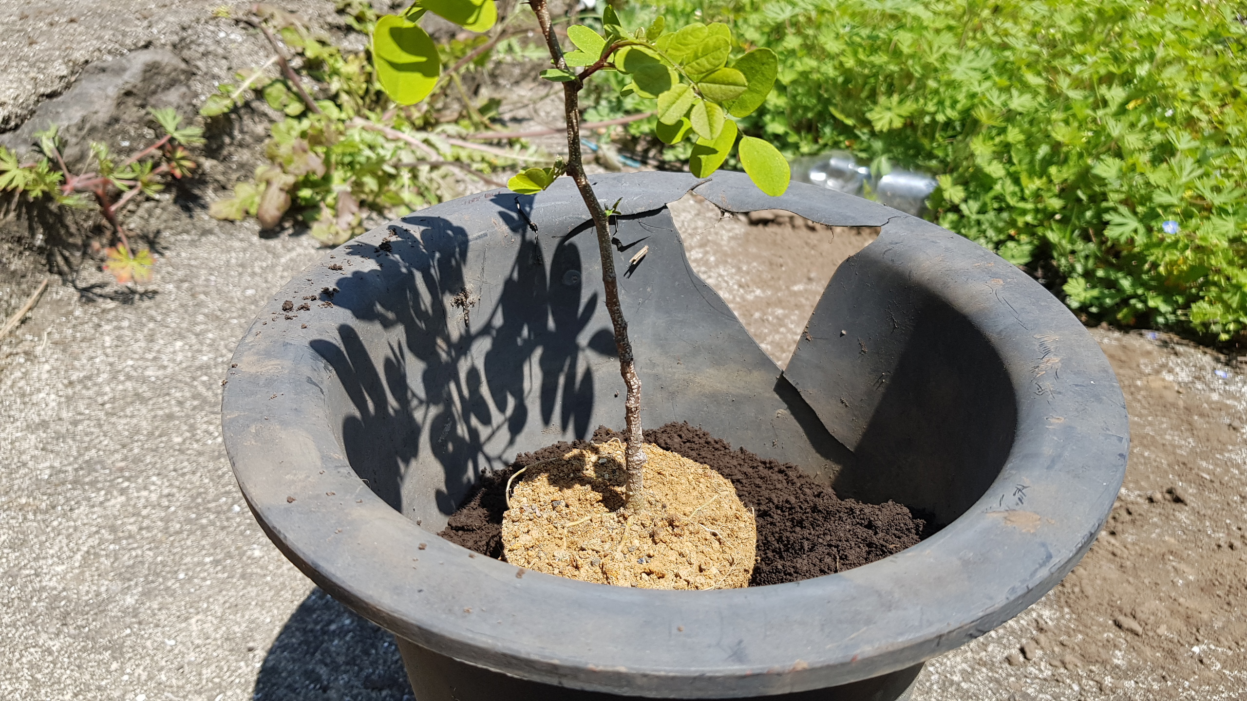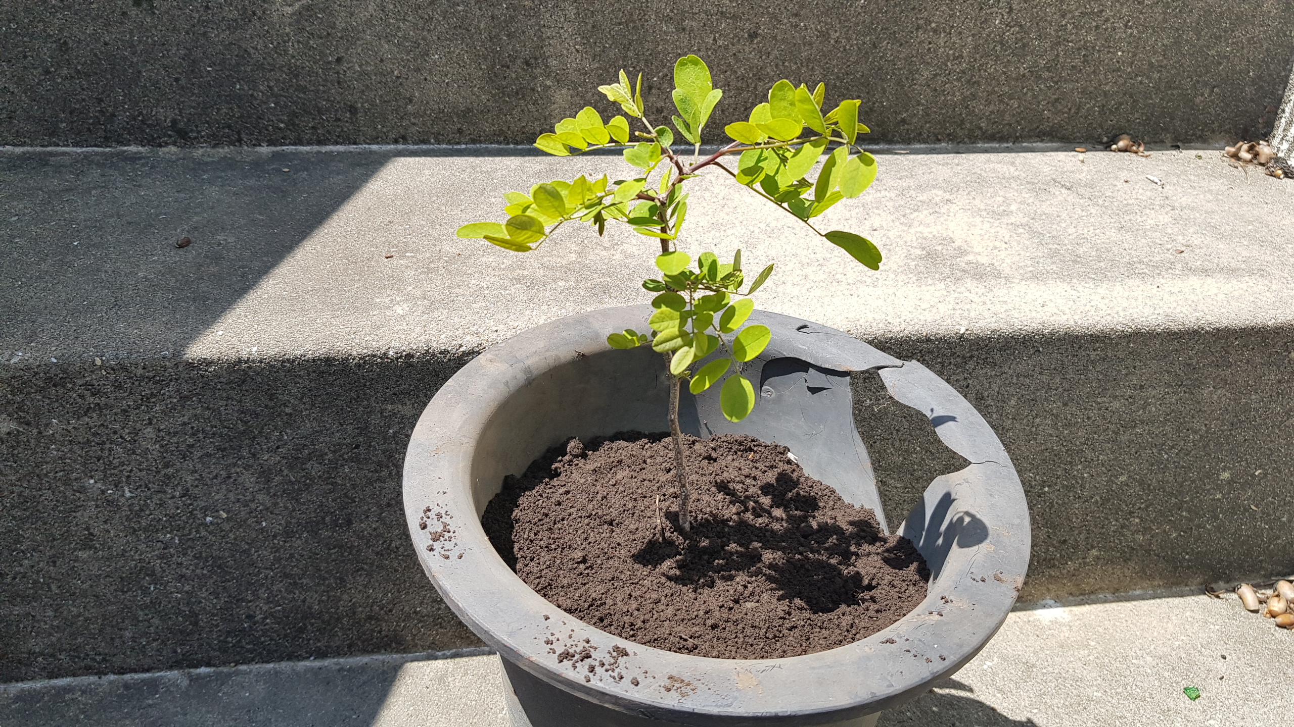 화분을 준비했습니다 아까시나무는 뿌리가 많이 번지는 식물이기 때문에 화분은 최대한 넓고 깊은 화분을 사용하는 것을 추천드립니다 사진에 보이는 화분은 집에서 굴러다니는 화분을 사용했습니다 너무 크거나 작은 화분밖에 없고 적당한 크기는 이런 것 밖에 없어서 위에 깨져있지만 그래도 아랫부분은 멀쩡하기 때문에 큰 문제가 되지 않을 것 같다는 판단으로 이 화분을 아까시나무 분갈이 화분으로 선택했습니다